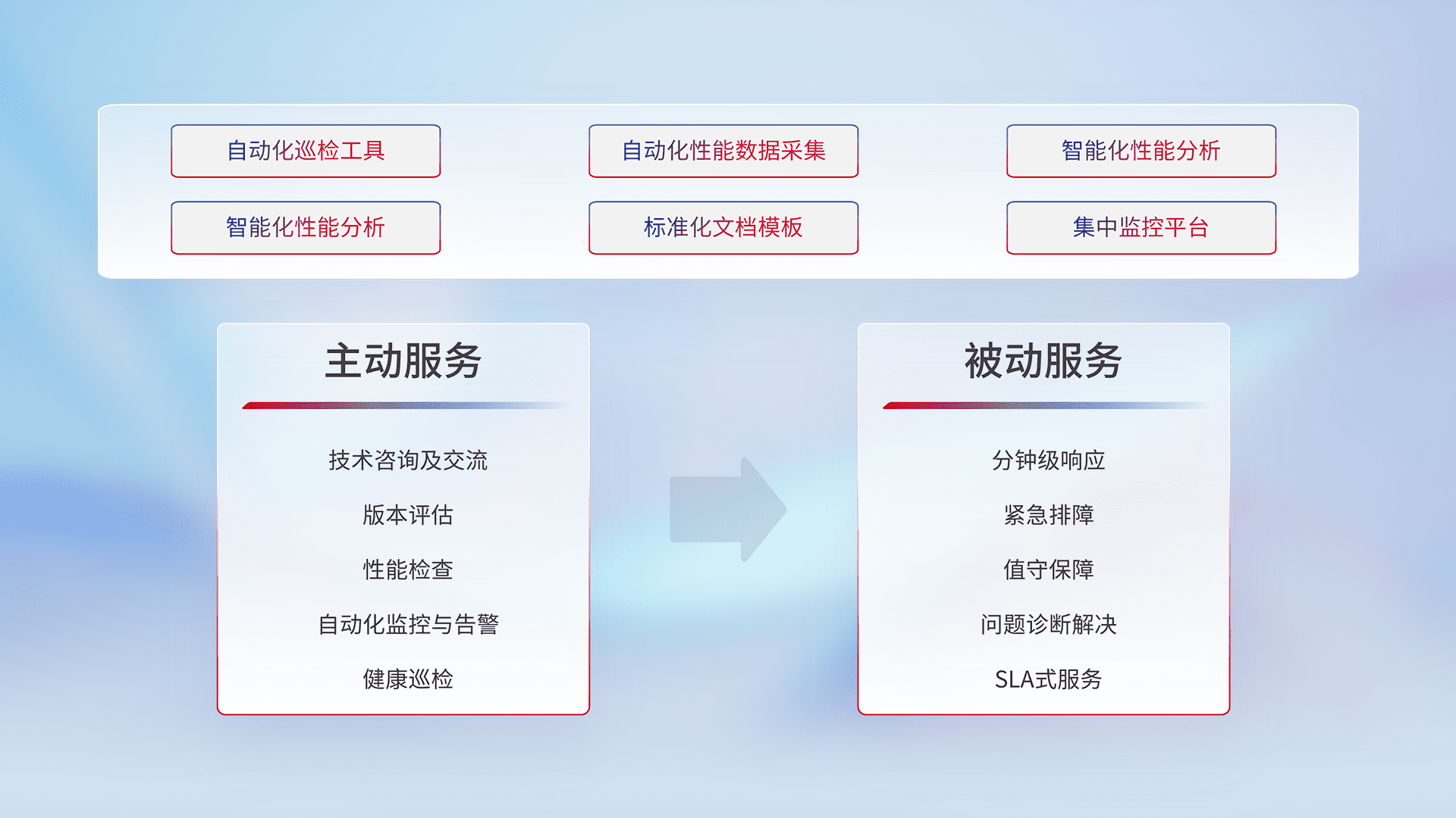 智能化工具和标准化文档,,,,保障服务质量,,,提供主动服务(包含技术咨询、、、版本评估、、、性能检查、、、自动化监控与告警、、、、健康巡检)和被动服务包含(分钟级响应、、、紧急排障、、、、值守保障、、、、问题诊断解决、、SLA服务)。。。。